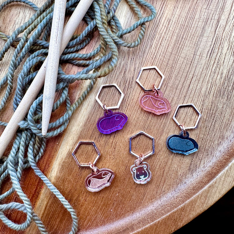 This set of (5) stitch markers can be customized to your liking. All of our items are made to order based on your modifications. Simply choose your preferred material (acrylic or wood), stitch marker ending/finish of choice, and we will take care of the rest!
